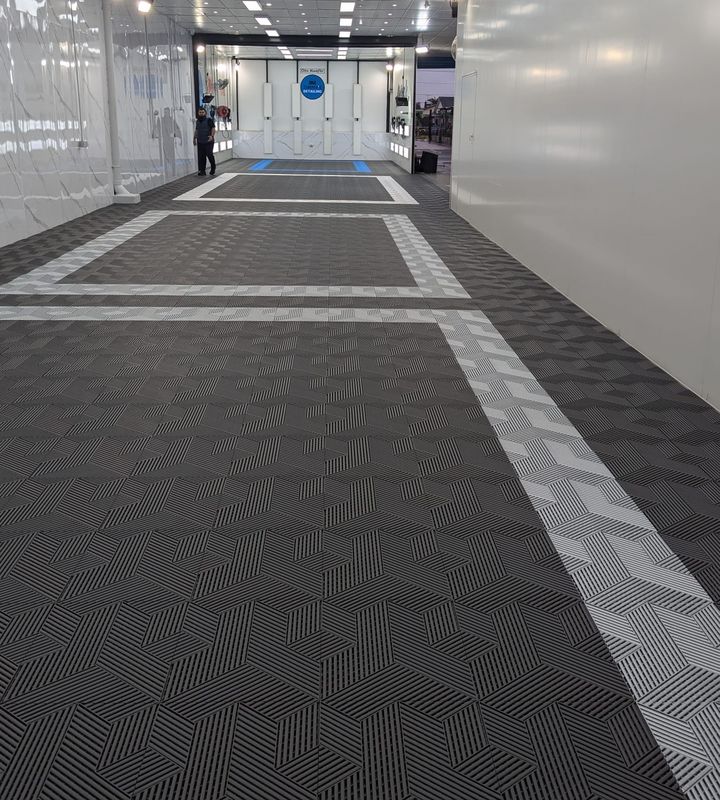 Salony pokazowe:Płytki podłogowe garażowe Readygo 3D-cubic to doskonały wybór dla sal wystawienniczych.Wzór zamykający umożliwia łatwą instalację, co jest niezbędne dla sal wystawienniczych, które muszą być szybko i skutecznie ustawione. Trwałość płytek i odporność na plamy i rozlewy ułatwiają ich utrzymanie,dbając o to, aby Twój salon zawsze wyglądał najlepiej.